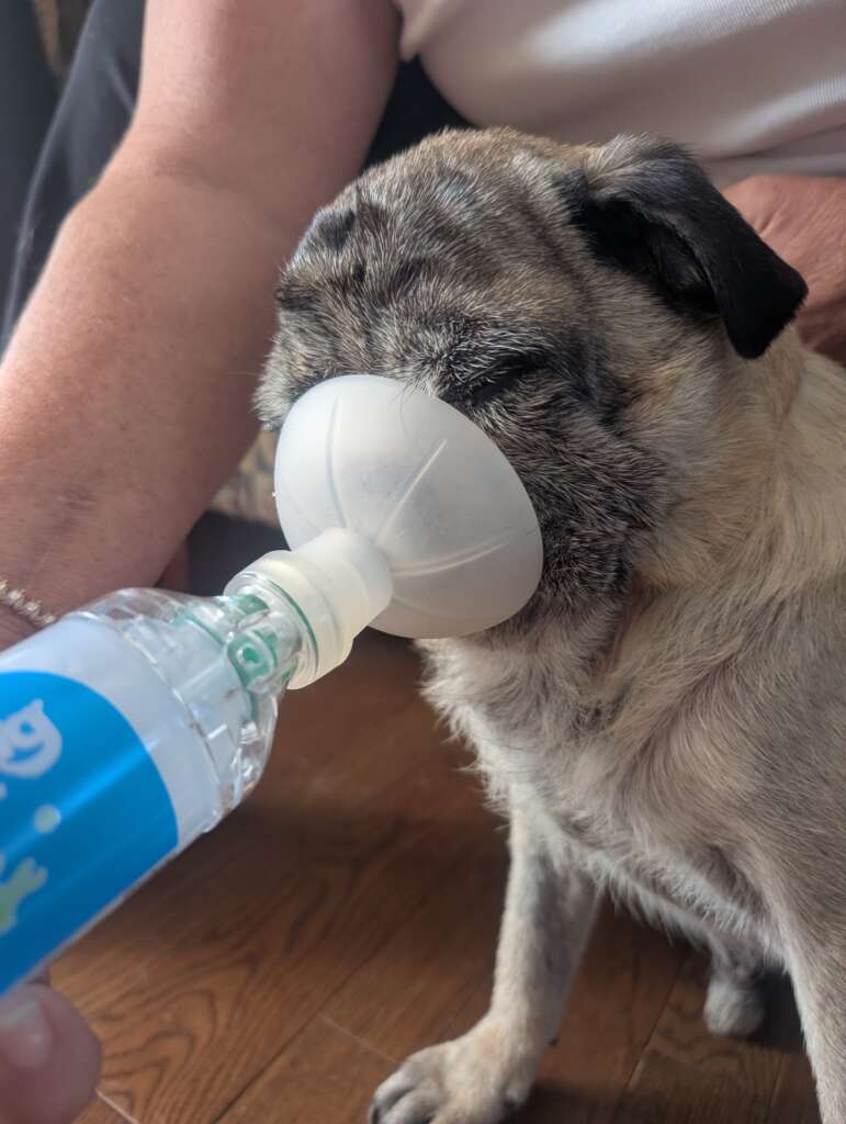 Rowdy’s previous vet put him on a steroid called prednisone to help reduce swelling and make it easier for him to breathe. Prednisone is a medication taken by mouth and commonly used to treat airway swelling in our little brachycephalic dogs. It is very effective, but if taken for too long one of the major side effects is causing diabetes. Sadly, that is what happened to Rowdy. So now, along with having trouble breathing, the diabetes meant his blood sugars were high and out of control. This was causing him to drink more water, pass more urine, and he was losing weight despite still being hungry.