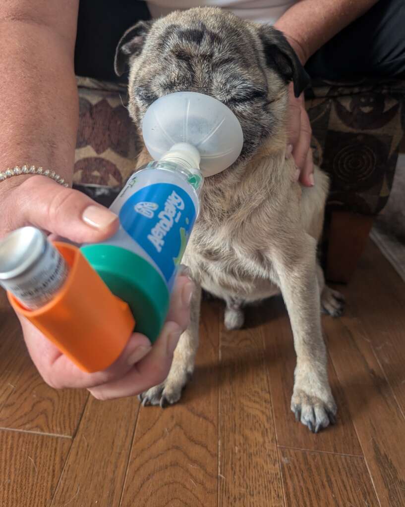When he came to see Dr. Kathleen at Thorndale Animal Hospital, she did some blood and urine tests and soon realized what the problem was. She switched him from his oral steroid, prednisone, to a steroid inhaler called Flovent. If you know anyone with asthma, you might be familiar with the Flovent inhaler since it’s actually made for people. “How can you get a dog to use an inhaler?”, you might ask. Well, there’s a device called an AeroDawg chamber, and it works very well and easily with an inhaler designed for people. The big advantage of using the inhaled steroid is it doesn’t get absorbed into the bloodstream, so the underlying cause for Rowdy’s diabetes was quickly stopped. Dr. Kathleen was able to control his diabetes with insulin. Now he’s a happy dog who can breathe easily and his serious health problems are under control.